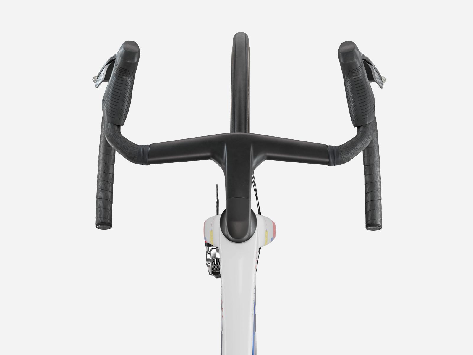 Die neue einteilige Lenker/Vorbau-Einheit ist leichter, aerodynamischer und ergonomischer als die Vorgängerversion. Darüber hinaus ermöglicht der im Vergleich zum Unterlenker 3 cm schmalere Oberlenker die Anpassung der Positionierung auf dem Bike, um entweder in der Oberlenkerposition von einer besseren Aerodynamik zu profitieren oder im Unterlenker mehr Kraft aufs Pedal zu bringen.